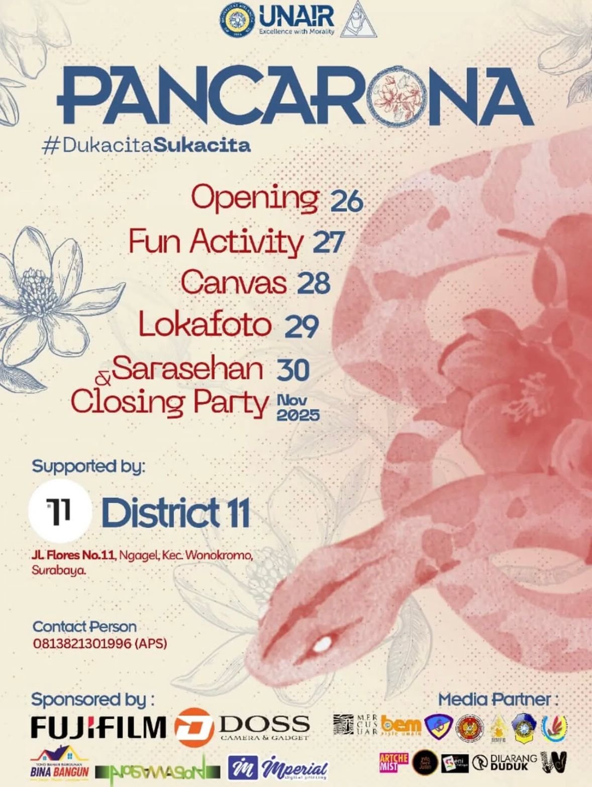 https://share.google/CMZgBWpUc5ntk47l8 Jl. Flores No.11, Ngagel, Kec. Wonokromo, Surabaya, Jawa Timur, Surabaya, IndonesiaAPS UNAIR Proudly Present:A Photography Exhibition 🤍🌺PANCARONA🌺🤍 DukaCitaSukaCita Di balik setiap kehilangan, selalu ada gema perasaan yang tak sempat terucap.Ada penolakan yang perlahan melemah, amarah yang berubah menjadi rindu, kesedihan yang menenangkan diri, hingga penerimaan yang datang seperti nada terakhir dari lagu yang pernah kita dengar. 🌺PANCARONA🌺 merupakan perjalanan untukmenelusuri perubahan itu, menatap duka dan...