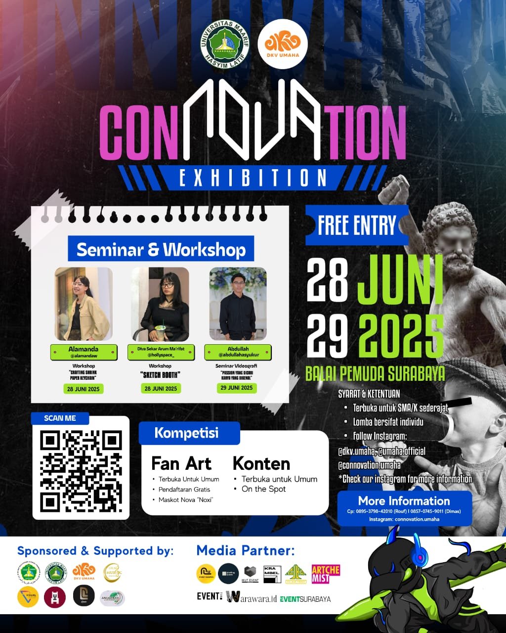 CONNOVATION III🎨💫🚀 Halo semuanya, kami dari DKV UMAHA mempersembahkan Pameran Karya Tugas Akhir CONNOVATION 3 yang bertemakan “NOVA” 🗓 : 28 - 29 Juni 2025 📍 : Balai Pemuda Surabaya 🎫 : FREE ENTRY WORKSHOP & SEMINAR 💡 Terbuka untuk umum 🗣 Alamanda ( Art and Media Project) “Crafting Shrink Paper Keychain” 🗣 Diva Sekar...