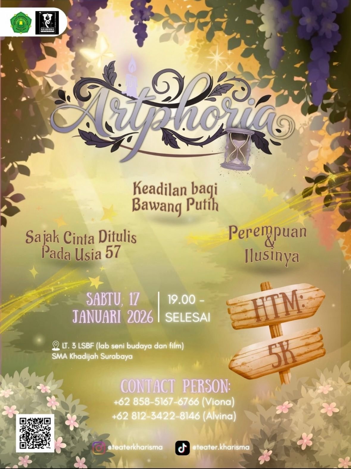 🎭ARTPHORIA IS HERE🎭 🤫Sstt..siap-siap masuk ke dunia ilusi dan kenangan. Pementasan perdana "ARTPHORIA: llusi dan Kenangan" oleh Teater Kharisma sudah dekat, pastikan teman-teman dapat tiketnya ya! 🗓️Sabtu, 17 Januari 2026🕧Open Gate : 18.30 - selesai📍SMA Khadijah Surabaya, LSBF Lt. 3🎟️HTM Rp 5.000,🔗Buruan dapetin tiketnya di https://bit.ly/Tiket-Artphoria (Limited Seat) Perlu info lebih lanjut & ada pertanyaan?...