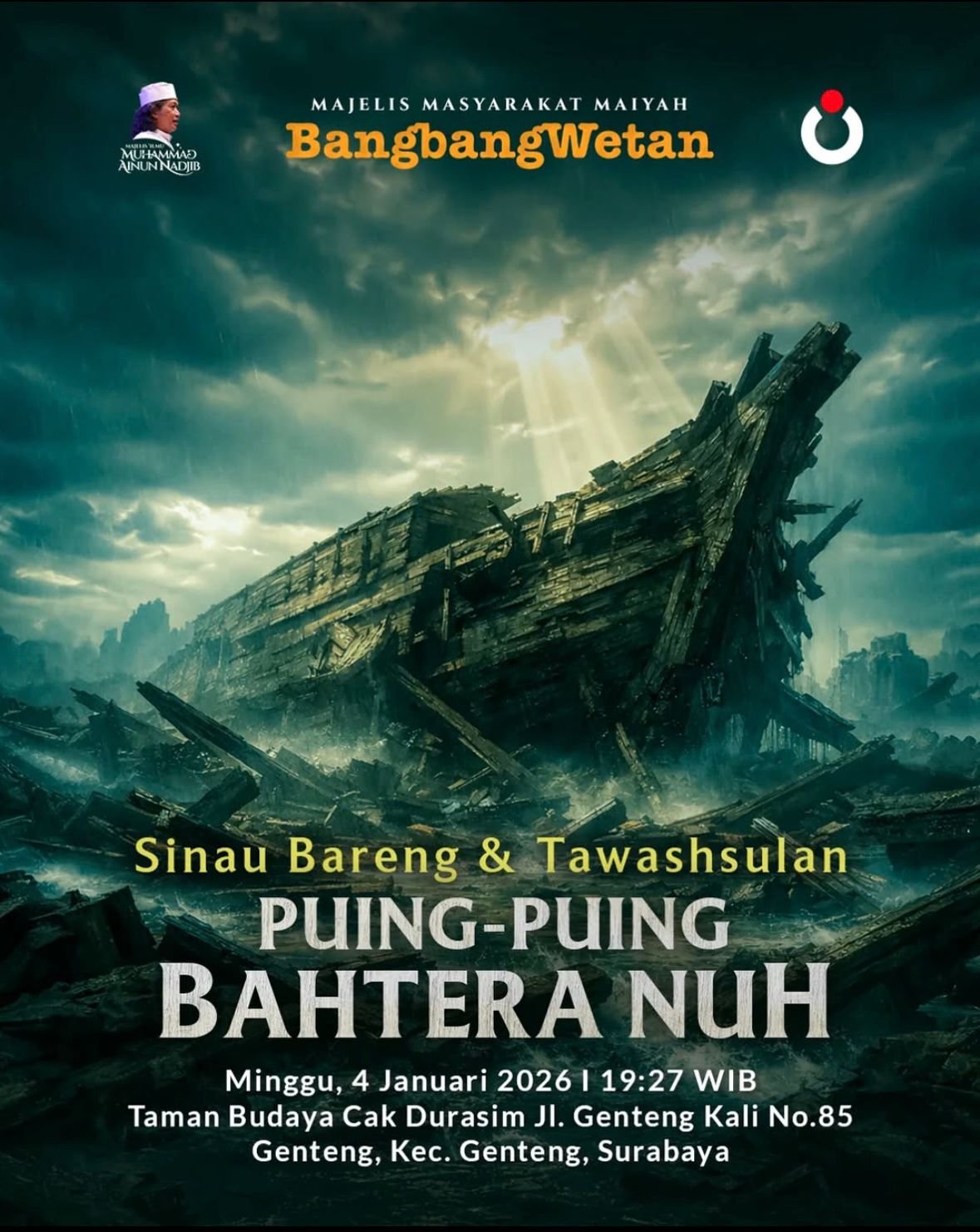 BANGBANG WETAN EDISI JANUARI2026 PUING-PUING BAHTERA NUHMinggu, 4 Januari 2026 | 19.27 WIBTaman Budaya Cak DurasimJI. Genteng kali No. 85. Kec. Genteng, Surabaya.