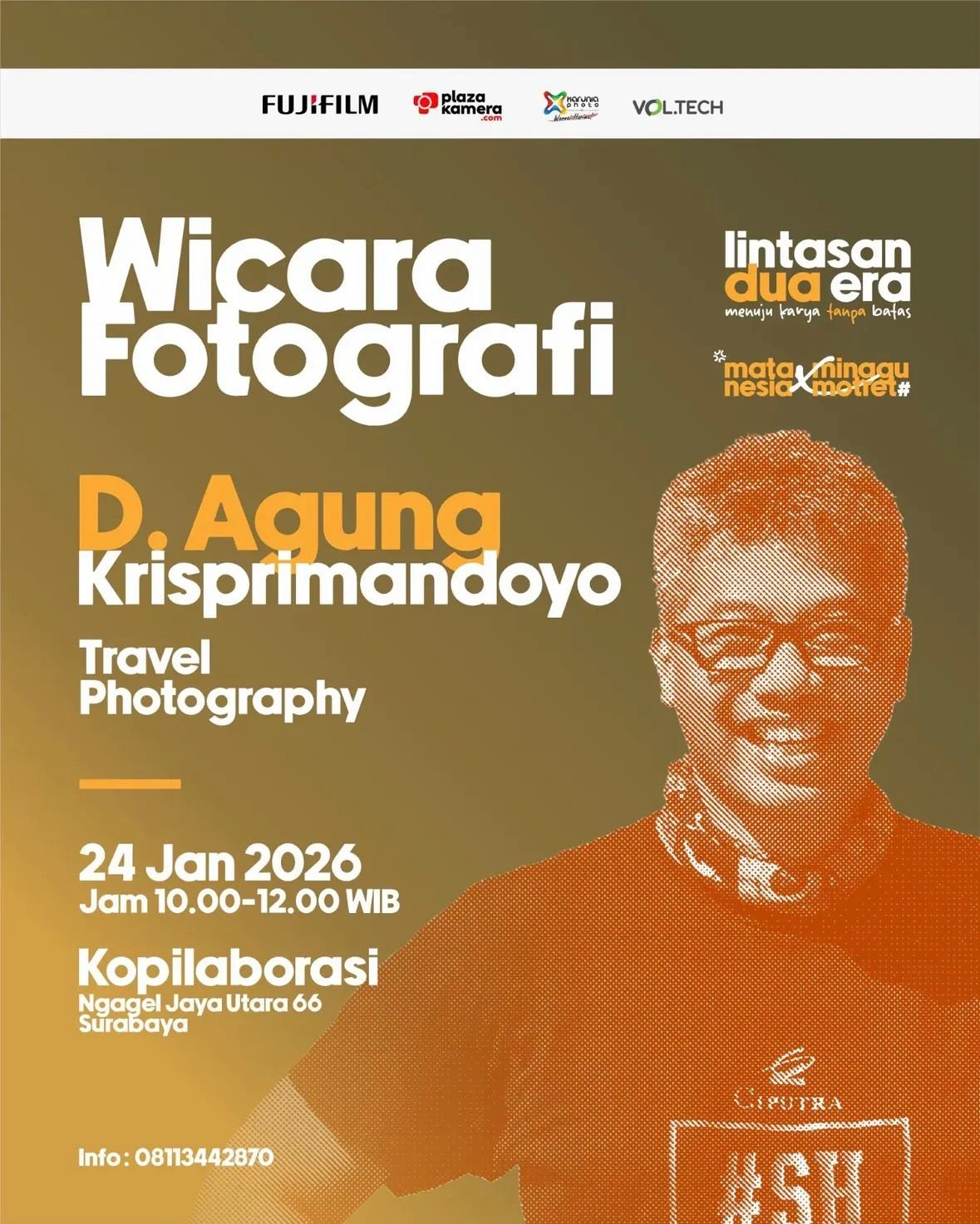 Lintasan Dua Era : Menuju Karya Tanpa Batas.@matanesia x @minggumotretsurabaya mempersembahkan sebuah acara kolaborasi awal tahun yang menandai perjalanan dua puluh tahun Matanesia dan satu tahun Minggu Motret..Menghadirkan wicara fotografi bersama @krisprimandoyo , seorang travel fotografer yang telah merekam banyak tempat yang indah di Indonesia dan belahan dunia lainnya..Beliau akan berbagi cerita dan pengalaman seputar...